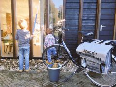 Maar voor een muzikant is op fiets naar het werk gaan toch lastig, kom ik achter. Zo ben ik afgelopen zondag niet op fiets naar de cd-presentatie in Grolloo gegaan. Want: veel te veel spullen mee. Daarom probeer ik zoveel mogelijk andere dingen met de fiets te doen. Even wat cd-tjes posten: kan prima op fiets. Naar bakker Pots: tuurlijk op de fiets. Oudste zoon van school halen: ook op de fiets. Maar als de jongste erbij is, wordt het lastiger, want de prachtige e-bike heeft helaas geen kinderstoel (en onze eigen kinderstoel omzetten is teveel gedoe, sorry). Daarom heb ik gisteren op mijn vrije woensdag de fiets ook maar vrij gegeven en 'em even uitgestald toen de mannen en ik de ramen gingen wassen. Want ja, dat moest ook echt gebeuren en is vast ook wel goed voor een mens.